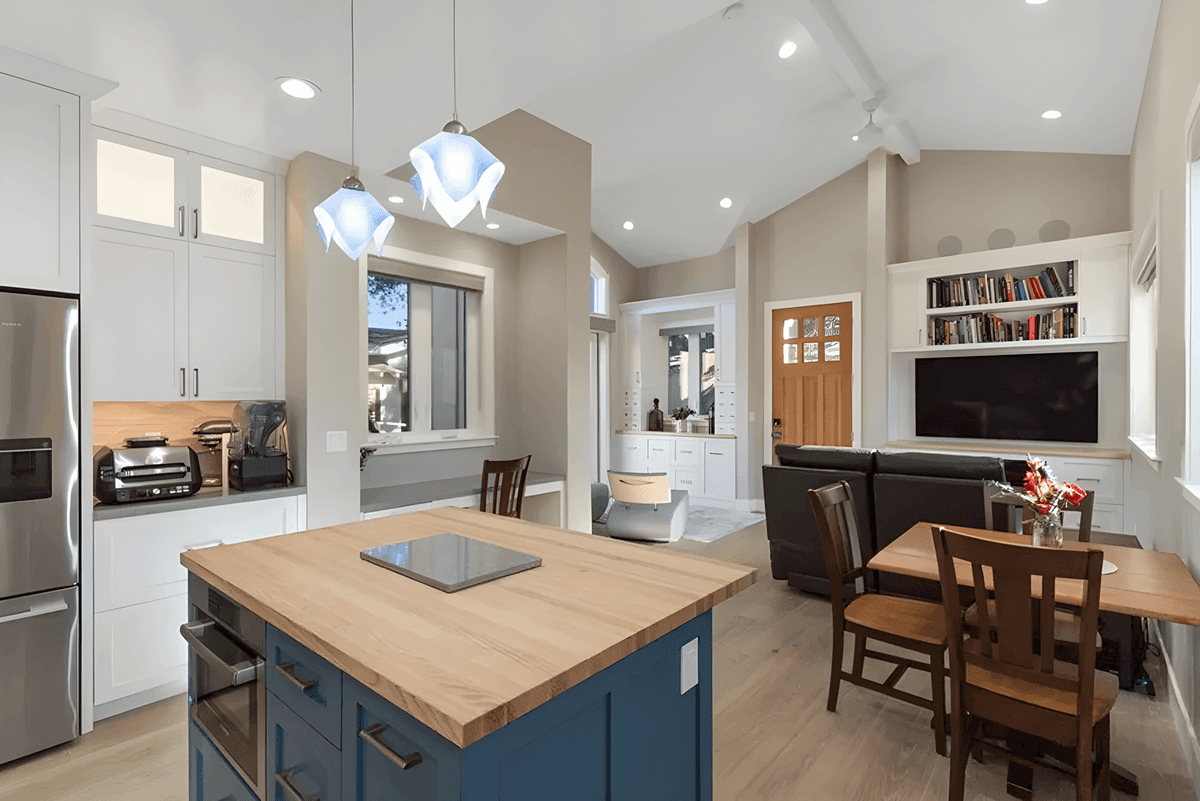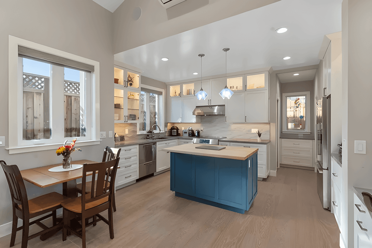 Inside, we opened everything up. The kitchen became the heart of the space, with white shaker cabinets that maximize storage and that pop-of-color island in teal blue. The homeowner’s wife insisted on it—”He needs at least one thing with personality,” she said. Those glass-front upper cabinets with interior lighting? Her idea too, and she was right. They make the whole space feel bigger and more intentional.