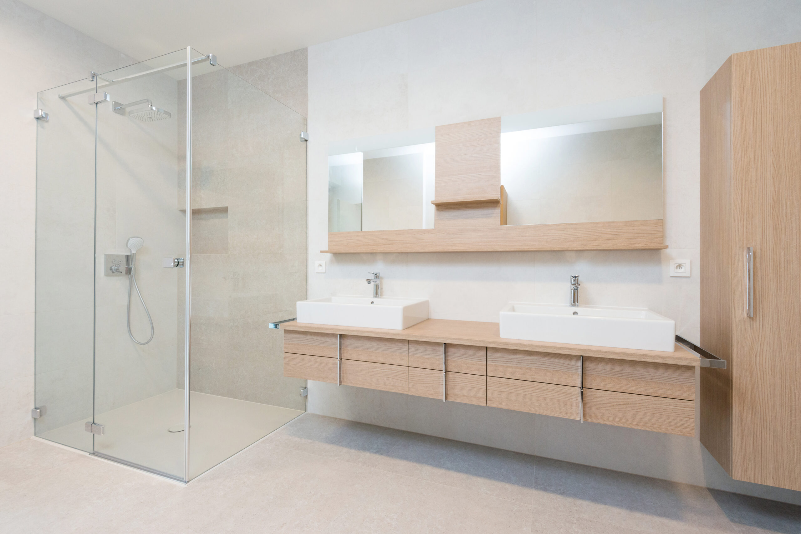 Technically, this remodel required considerable work. We installed a linear drainage system with the proper slope to ensure the water flows correctly, essential in a curbless shower design. Completely new waterproofing membranes, upgraded plumbing with thermostatic valve controls to prevent temperature fluctuations, and underfloor heating beneath the large-format tiles. Why not feel the warmth when you walk in the mornings?