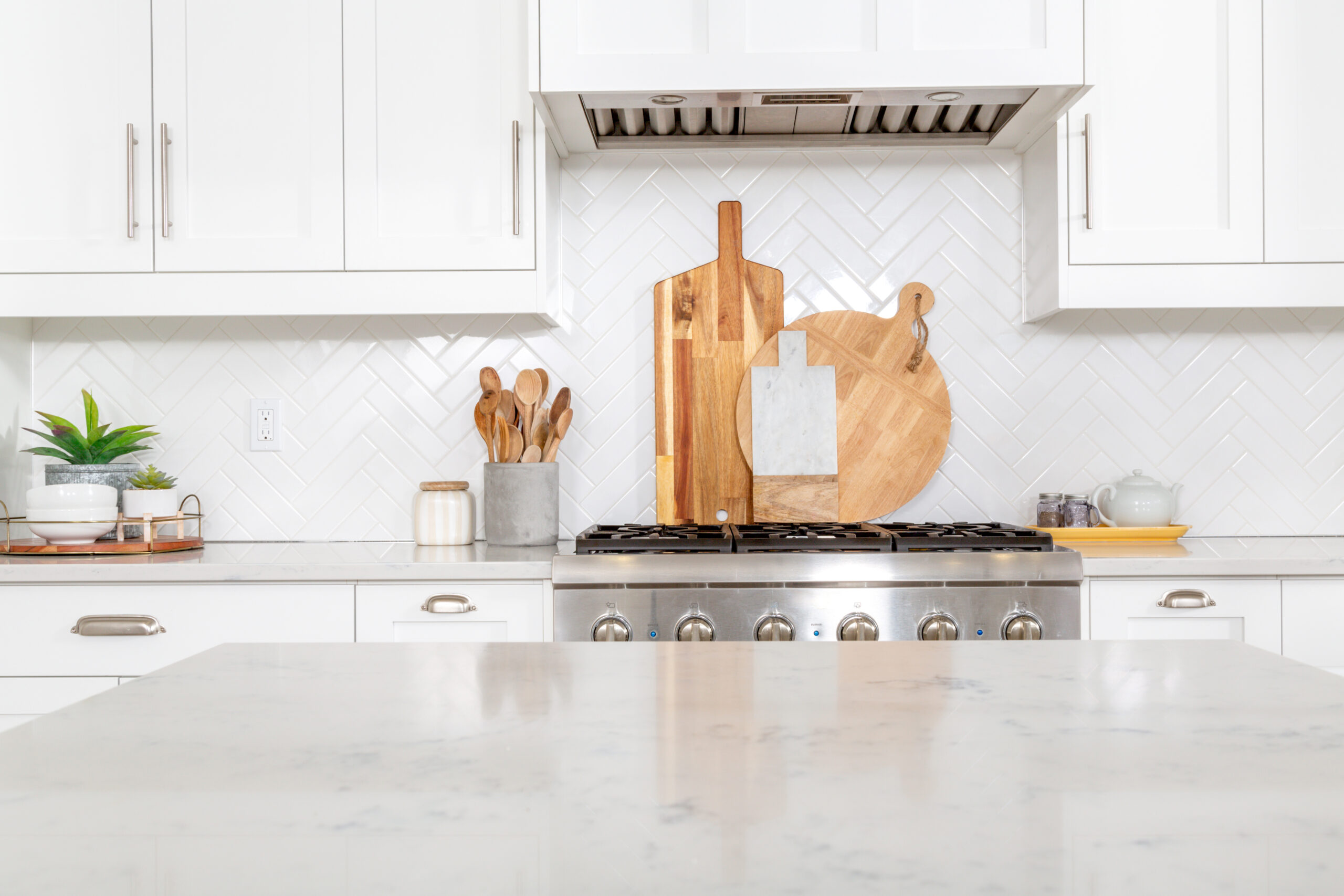 The quartz countertops were templated on-site for seamless integration, with careful attention to the waterfall edge detail and undermount sink cutout. Backsplash installation used classic white subway tile with precision-cut edges around outlets and the range area.