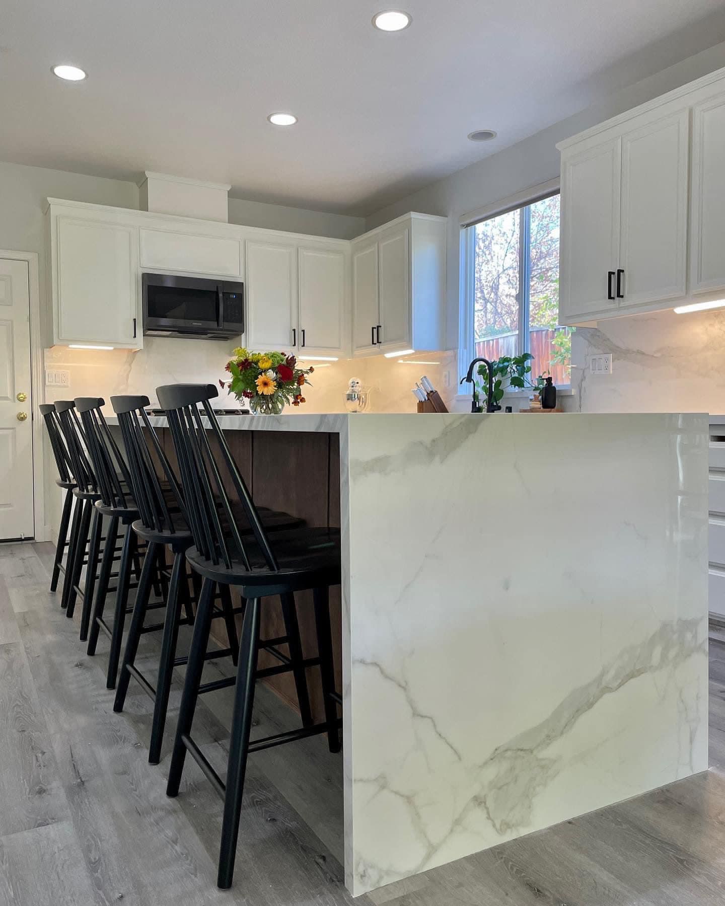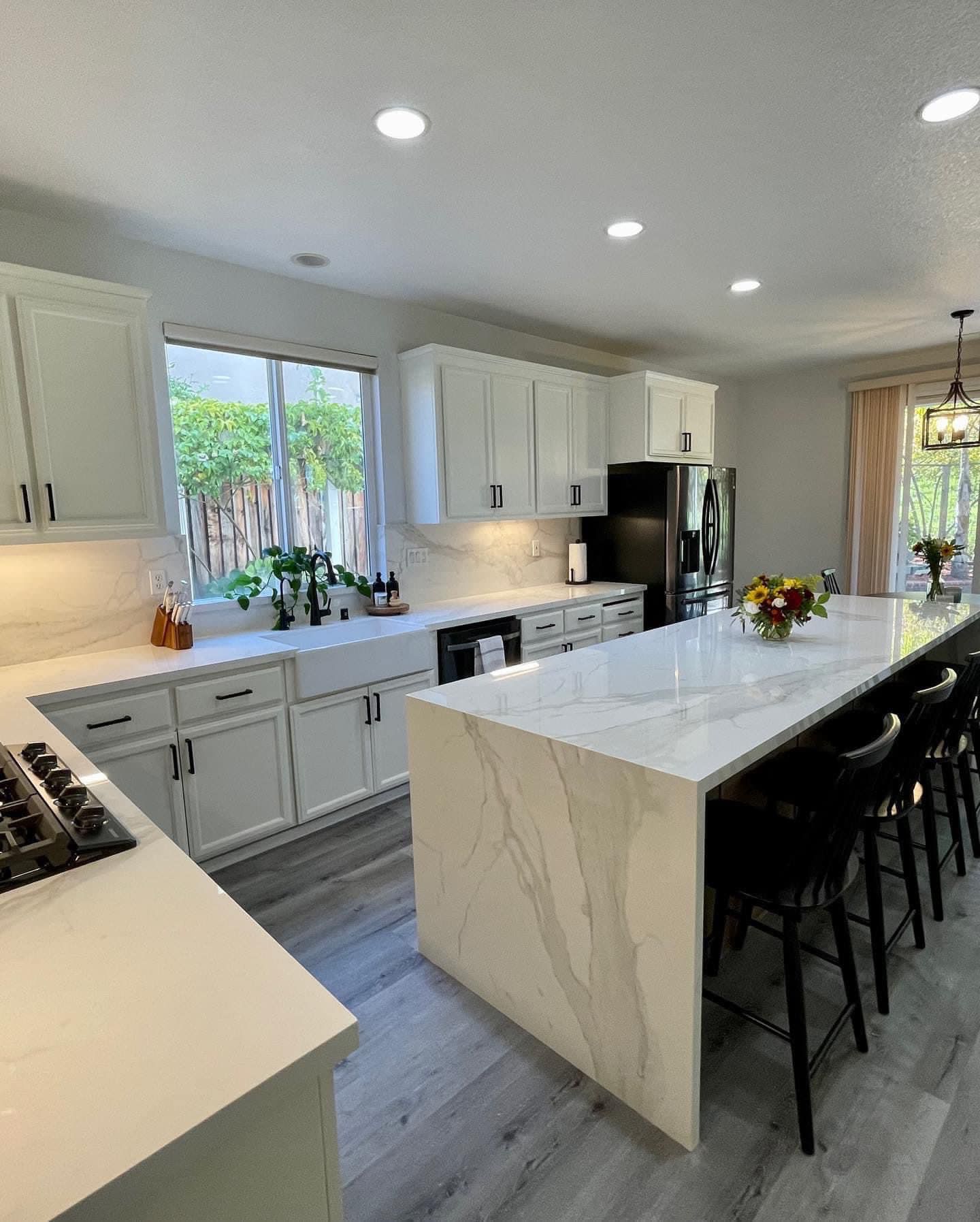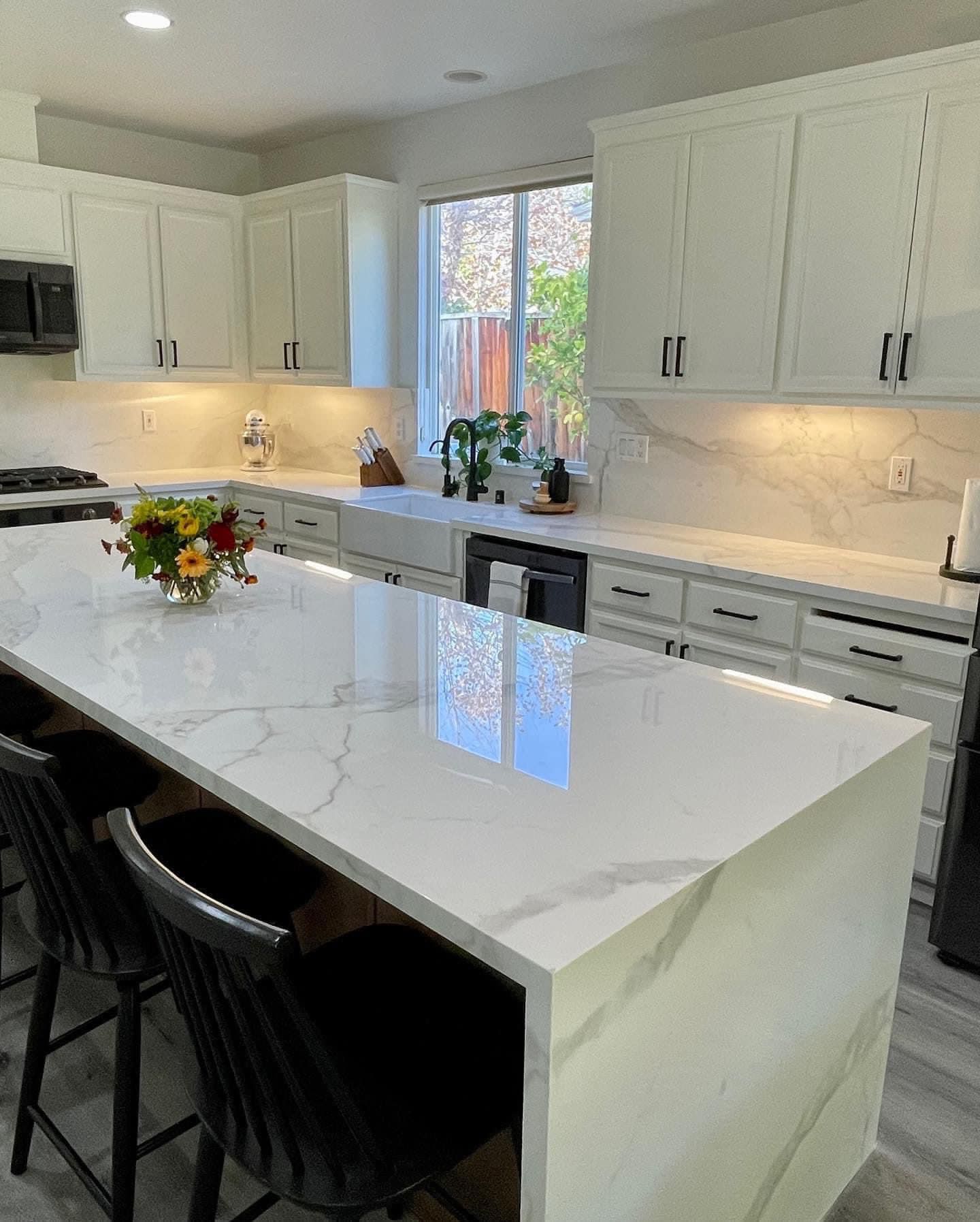 We completely reimagined the space from the ground up. Those crisp white shaker cabinets set the tone for everything—clean, classic, and incredibly practical with their matte black hardware. But the real showstopper? That waterfall island with its stunning marble-look quartz. The veining cascades down the side, creating a focal point that catches your eye the moment you walk in. It’s where the family camps out for breakfast, where friends lean with a glass of wine, where life happens.