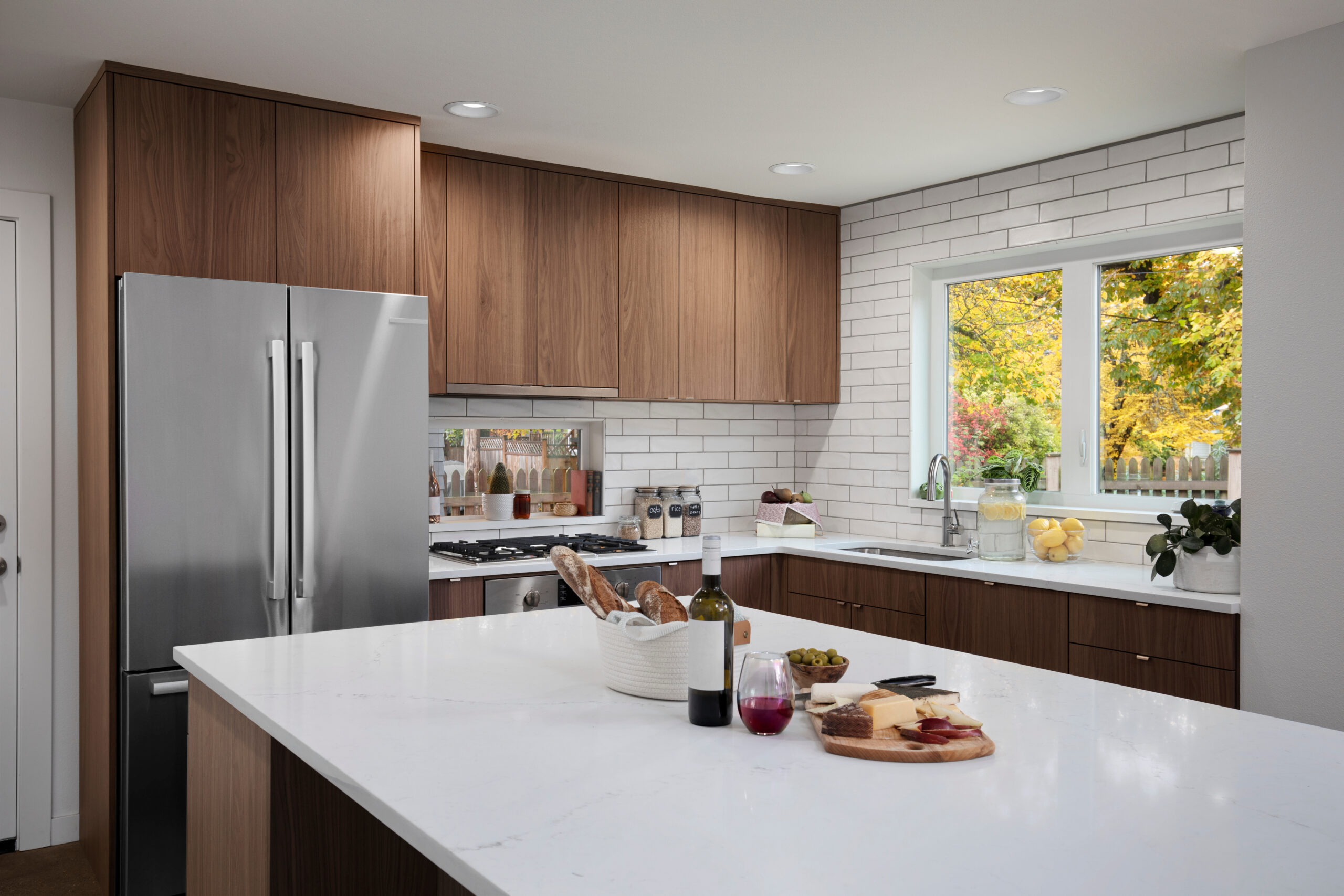 The kitchen embodies understated sophistication with horizontal-grain walnut cabinets that wrap three walls in warm, organic beauty. We designed them as flat-panel, slab-front doors—no fussy details, just pure material honesty. The upper cabinets sit flush against the ceiling, maximizing storage while maintaining those clean modernist lines.