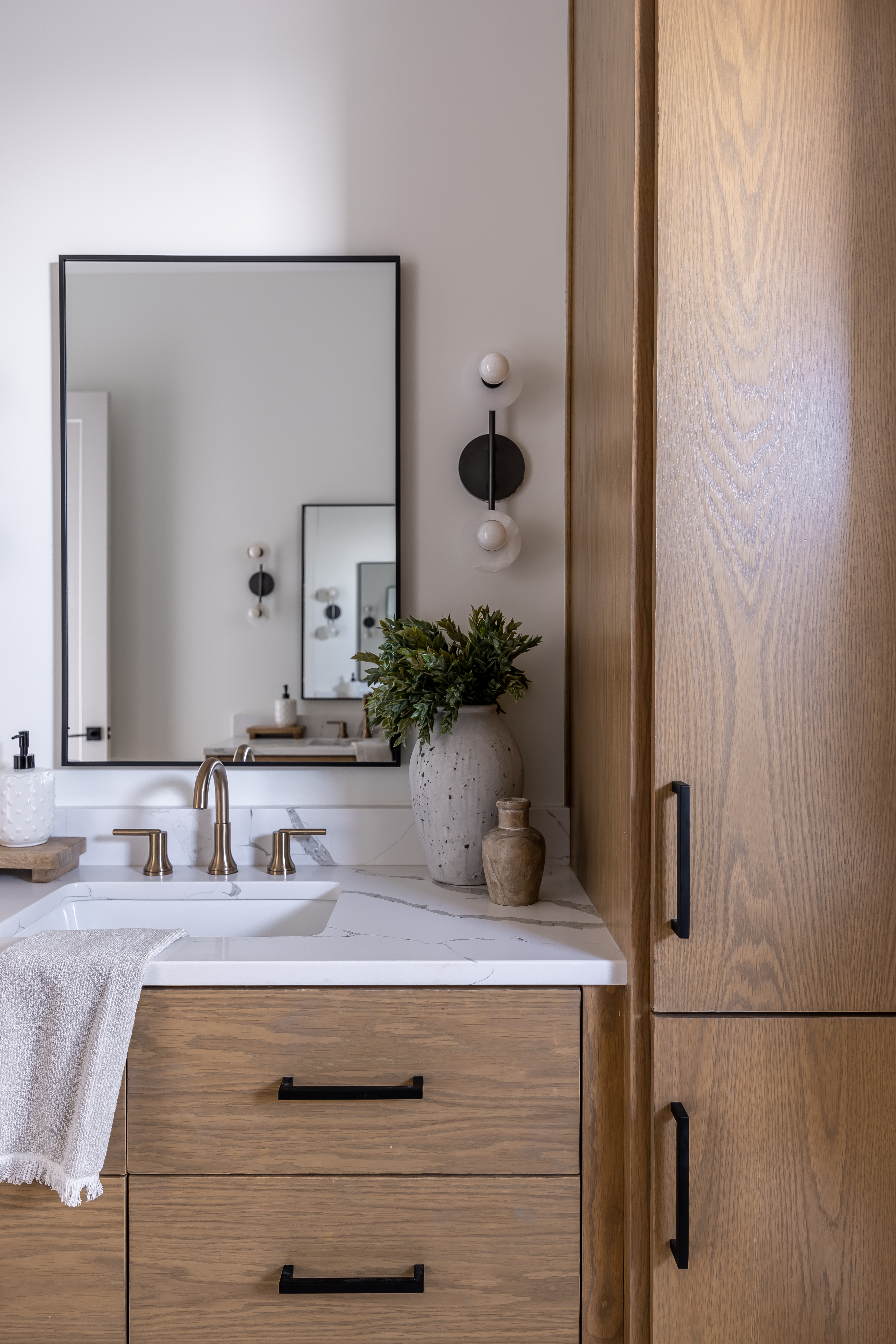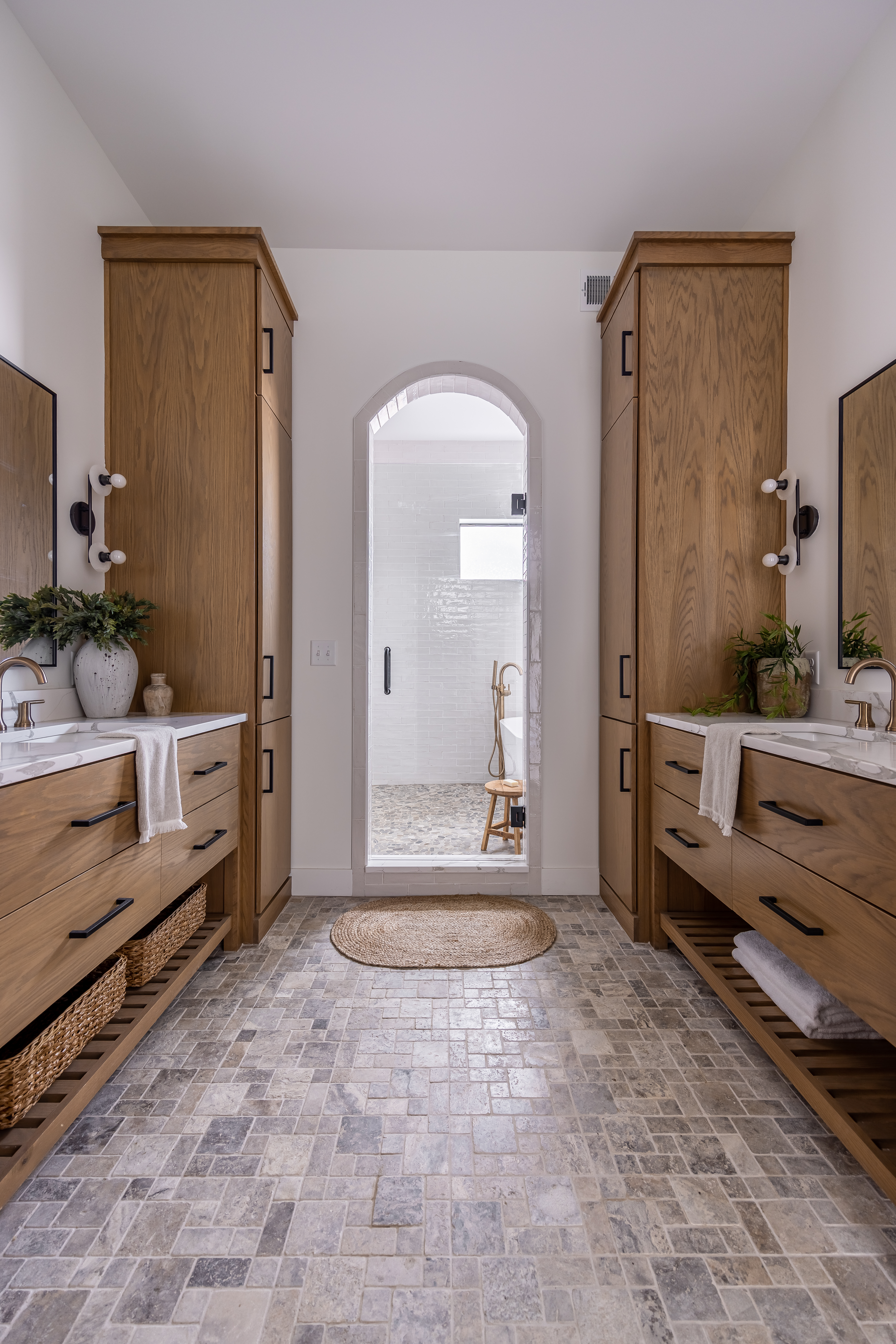 But what truly stands out is the master bathroom. The symmetrical layout with matching white oak vanities flanking an arched doorway leading to the shower is pure architectural drama. Through that arch, you glimpse the white-tiled bathroom: a spa-like sanctuary with a freestanding bathtub and walk-in shower that makes you feel miles away from the stresses of daily life.