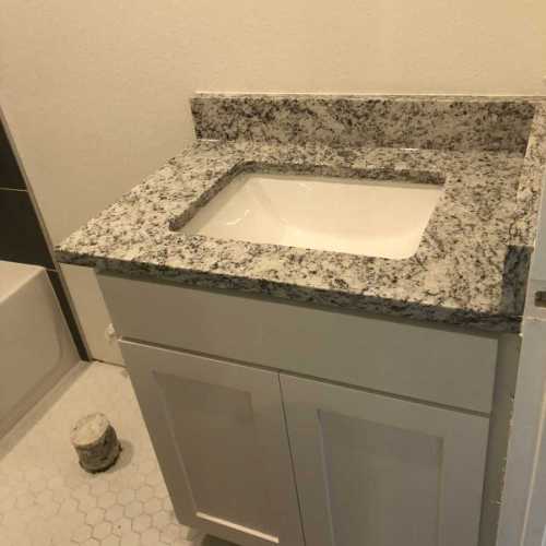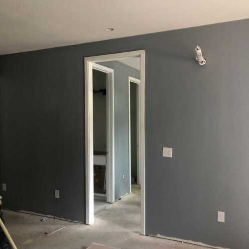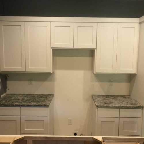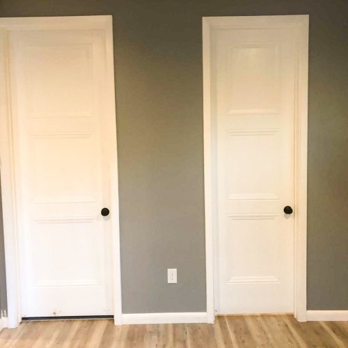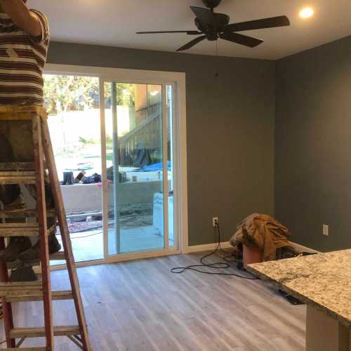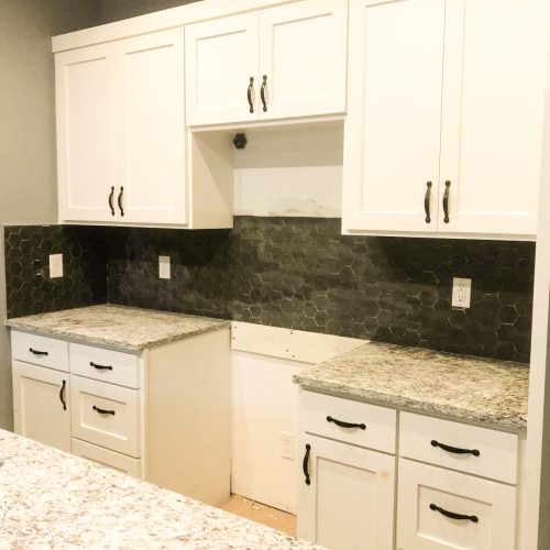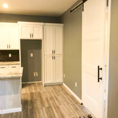 Inside, the kitchen surprised everyone with how complete it feels. White shaker cabinets reach the ceiling for maximum storage, granite countertops, full-size appliances—you could actually live here, not just visit. The dark gray walls were a bold choice that the homeowner initially questioned, but paired with the white cabinetry and wood-look flooring, it creates this sophisticated, modern vibe that feels nothing like a typical pool house.
