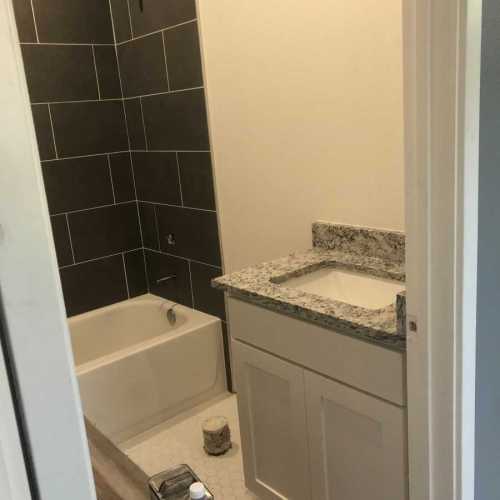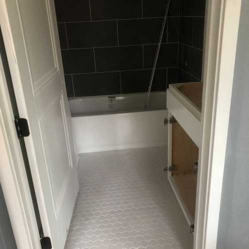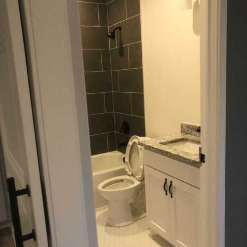 The bathroom keeps that same contemporary edge with large-format black tile in a staggered pattern and a tub-shower combo that’s actually comfortable. Again, these weren’t pool house compromises—these were real design decisions.